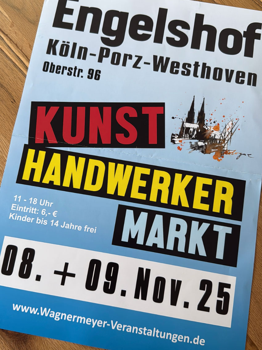 Aktuell bin ich jeweils auf dem Kunsthandwerkermarkt im wunderschönen Engelshof in Köln-Westhoven vertreten; nächster Ausstellungstermin wird der 7. und 8. November 2026 sein.