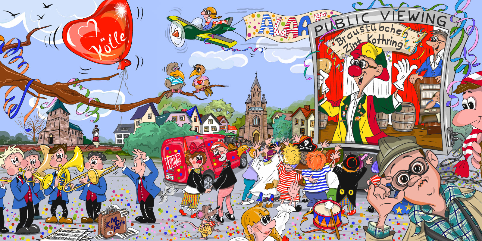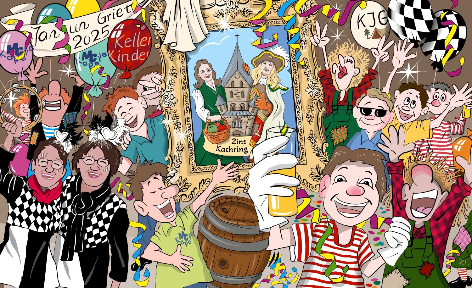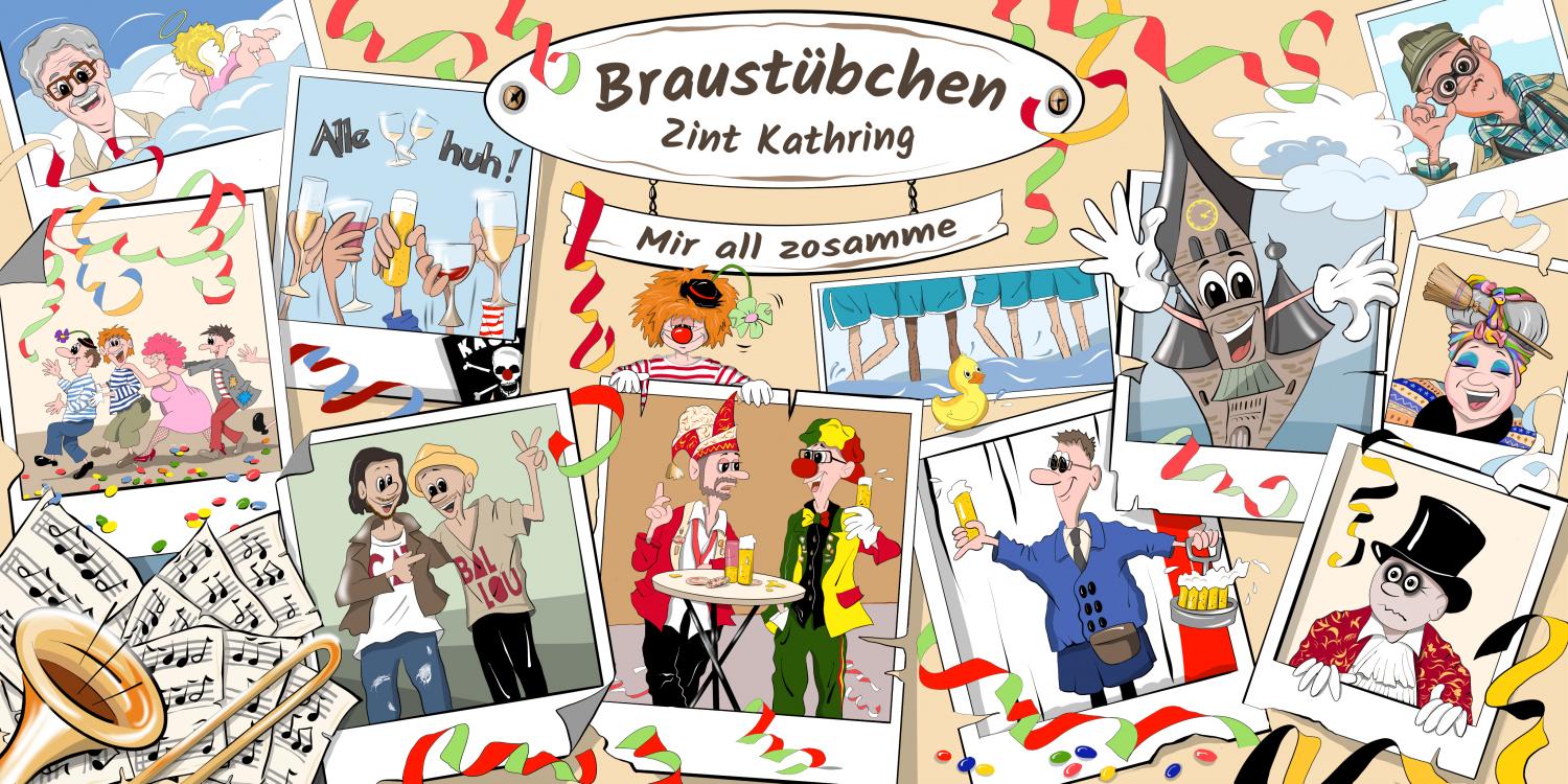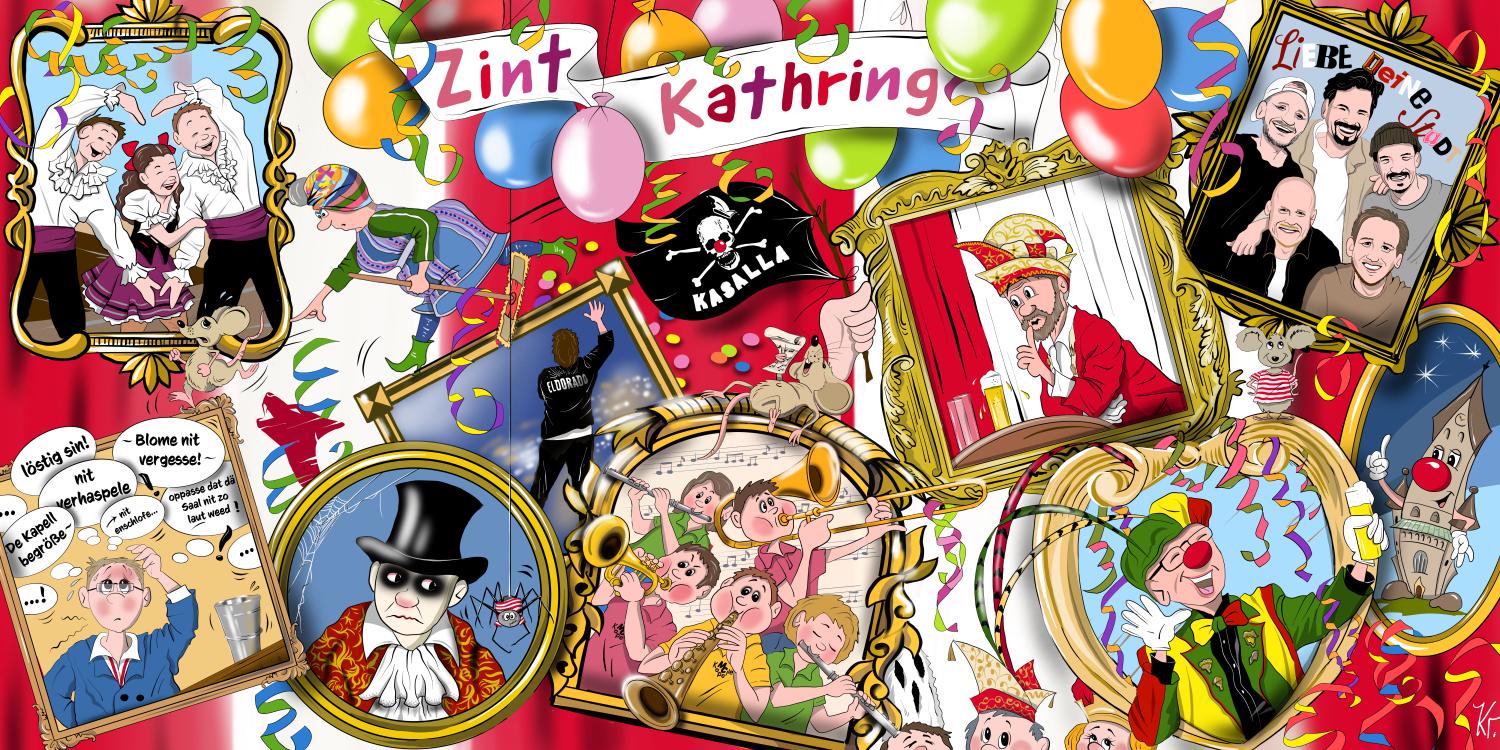 Eine relativ aufwändige Bühnendekoration mit einigen Kräften aus dem Kölner Karneval für die Pfarrsitzungen in St. Katharina, Köln-Niehl, 400 x 200 cm, Druck auf PVC-Plane
